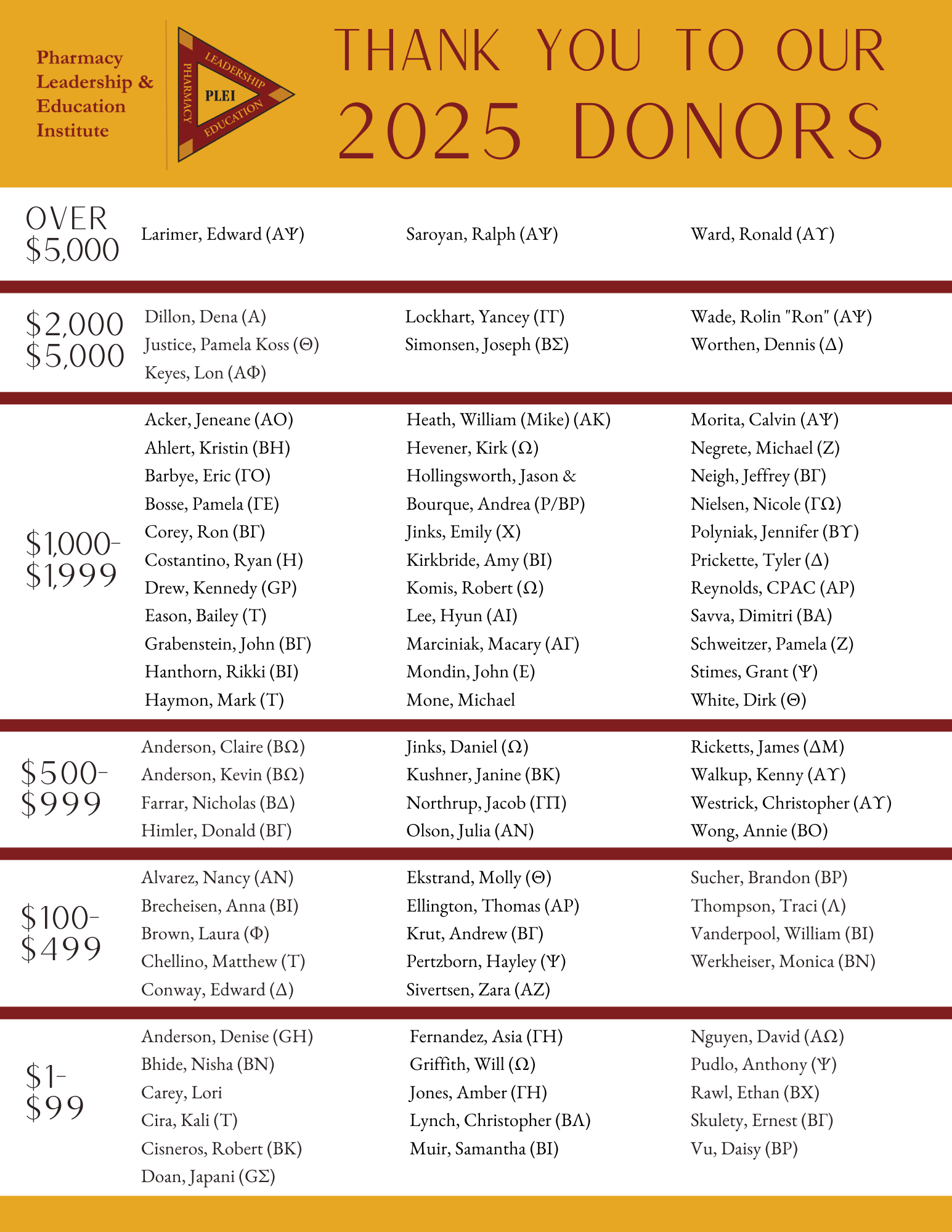 PLEI is very grateful to our donors who support us in our mission to create leaders in healthcare. We would like to extend our sincere thanks to the following individuals who contributed to PLEI in 2025. CLICK HERE if you would like to make a donation to support PLEI.